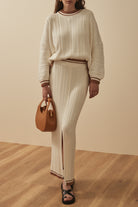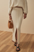 The Seeta Skirt is an everyday wearable classic. The beautifully textured rib is highlighted by tonal trim at the waistband and hem. This maxi length, relaxed fit skirt has a front split for functionality and visual appeal. The perfect piece to wear over and over, season to season.