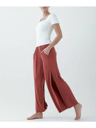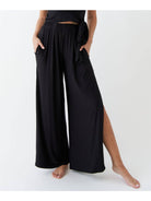 Bamboo jersey pull on pant with side slits. Wide leg. Side seam pockets. 96% bamboo viscose 4% spandex. Ethically made in the USA.